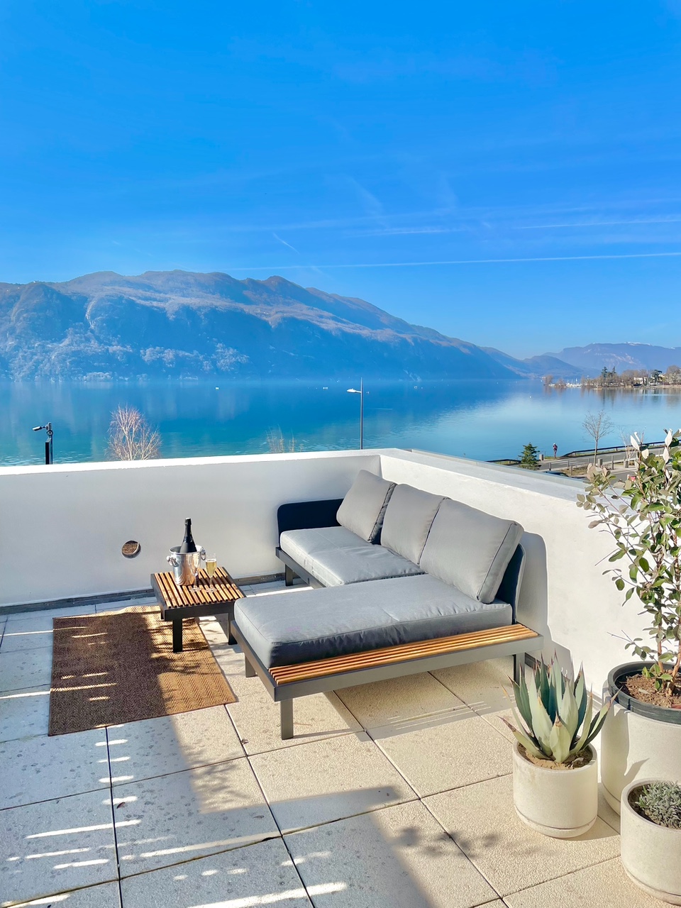 Profitez de la terrasse sur le lac pour admirer les couleurs du paysage. Déconnection assurée pour un week-end en amoureux, ou un séjour en famille de découverte du lac à vélo ou à pied et de ses montagnes.